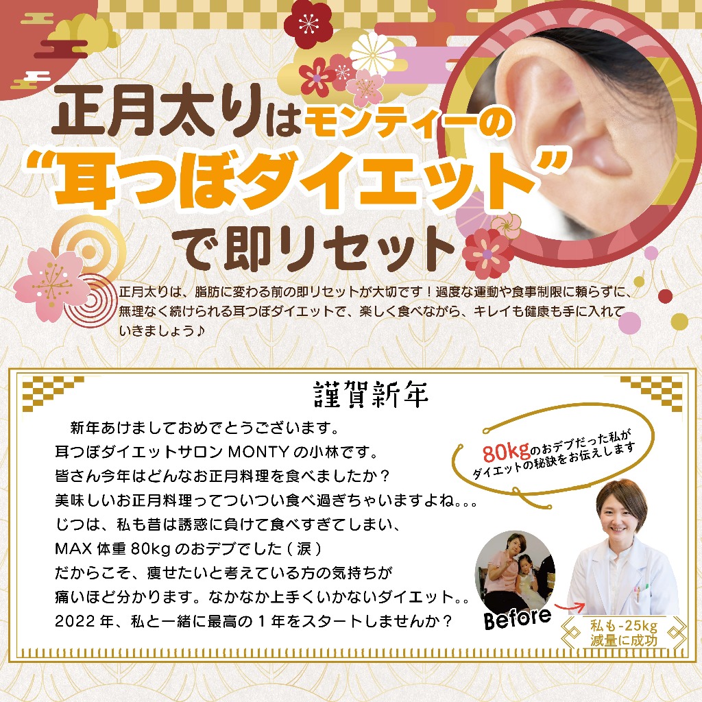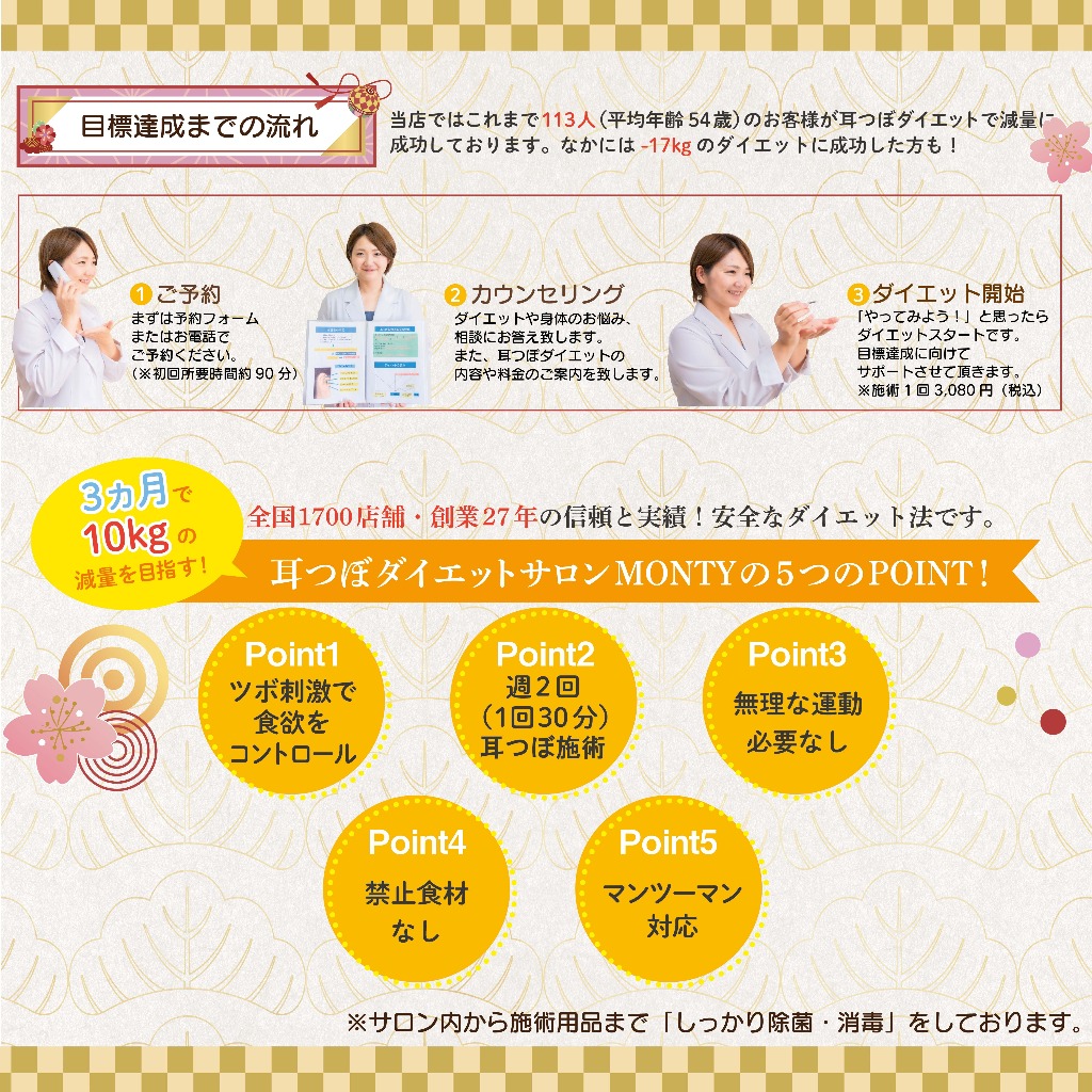 耳つぼダイエットサロンMONTYでは取り組みやすい痩身方法をアドバイス致します。